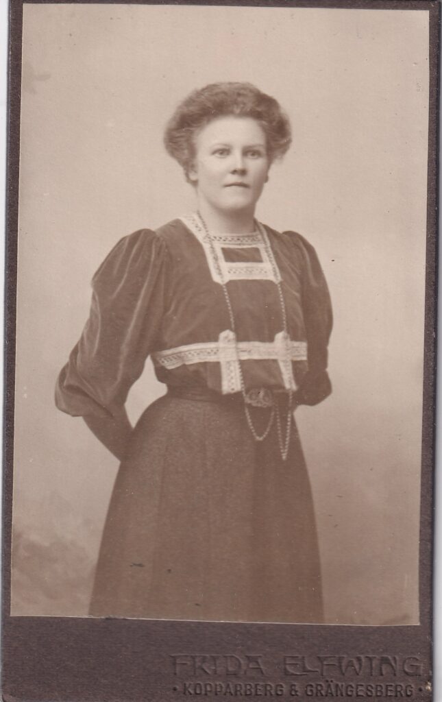 Augusta Elfrida Elfwing föddes i Grythyttan den 21:a juli 1874. Bosatt i Nora (1884-1900), Lindesberg (1901-1902), samt Kopparberg (1903-1909)