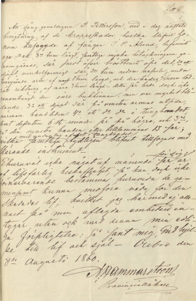 Då vid polisundersökningen de yttre skadorna tydligt kunde urskiljas och därvid även syntes, att vilda djur ätit av den högra armen och vänstra benet, synes den nu framskridna rötan bero på kroppens förflyttning ut ur kärret, där han legat nedgrävd i dyn, till luften vars temperatur under de sista dagarna varit tämligen ljum, och är det därför antagligt, att ej särdeles lång tid förflutit mellan mordet och dess upptäckande; vilket jag ej allenast på avlagd ämbetsed intygar utan och med denna min edeliga förpliktelse: Så sant mig Gud hjälpe. Till liv och själ; bekräftar Leon Engström